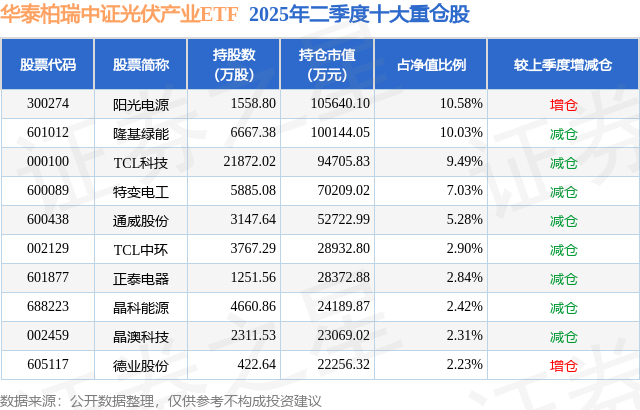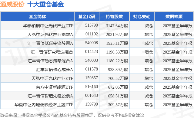 根据2025基金半年报公募基金重仓股数据,重仓该股的公募基金共63家,其中持有数量最多的公募基金为华泰柏瑞基金的华泰柏瑞中证光伏产业ETF。华泰柏瑞中证光伏产业ETF目前规模为99.84亿元,最新净值0.923(10月13日),较上一交易日下跌1.71%,近一年上涨18.84%。该公募基金现任基金经理为李茜 李沐阳。李茜在任的基金产品包括:华泰柏瑞上证红利ETF,管理时间为2019年11月5日至今,期间收益率为47.12%;华泰柏瑞中证港股通50ETF,管理时间为2020年12月30日至今,期间收益率为18.45%;华泰柏瑞中证物联网主题ETF,管理时间为2021年3月31日至今,期间收益率为41.19%。李沐阳在任的基金产品包括:华泰柏瑞光伏ETF联接A,管理时间为2021年8月17日至今,期间收益率为-42.38%;华泰柏瑞中韩半导体ETF(QDII),管理时间为2022年11月2日至今,期间收益率为137.86%;华泰柏瑞纳斯达克100ETF(QDII),管理时间为2023年3月1日至今,期间收益率为105.55%。