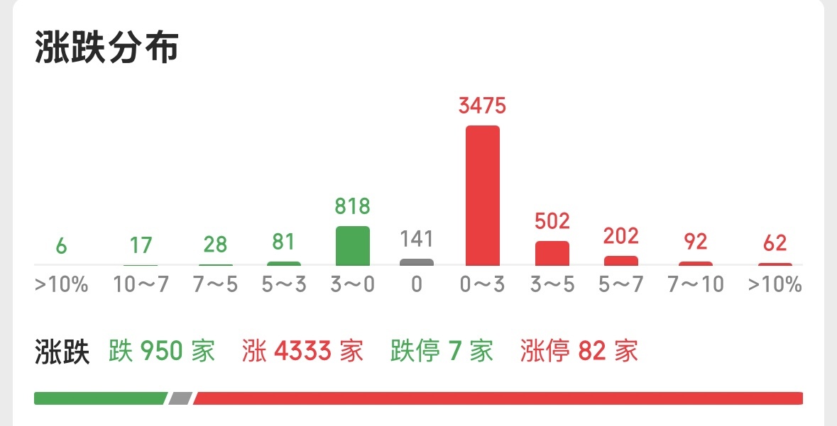 这是A股市场连跌三天后,许多股票连续大跌以来的第一次红盘,全市场超4300只个股上涨,涨幅在0%—3%的个股共3475只,3%—7%的个股共704只。其中川股成都华微、通威股份等表现不俗,三天涨幅超过了10%,不少投资者从中获得了实实在在的收益,实现了“吃肉喝汤”。