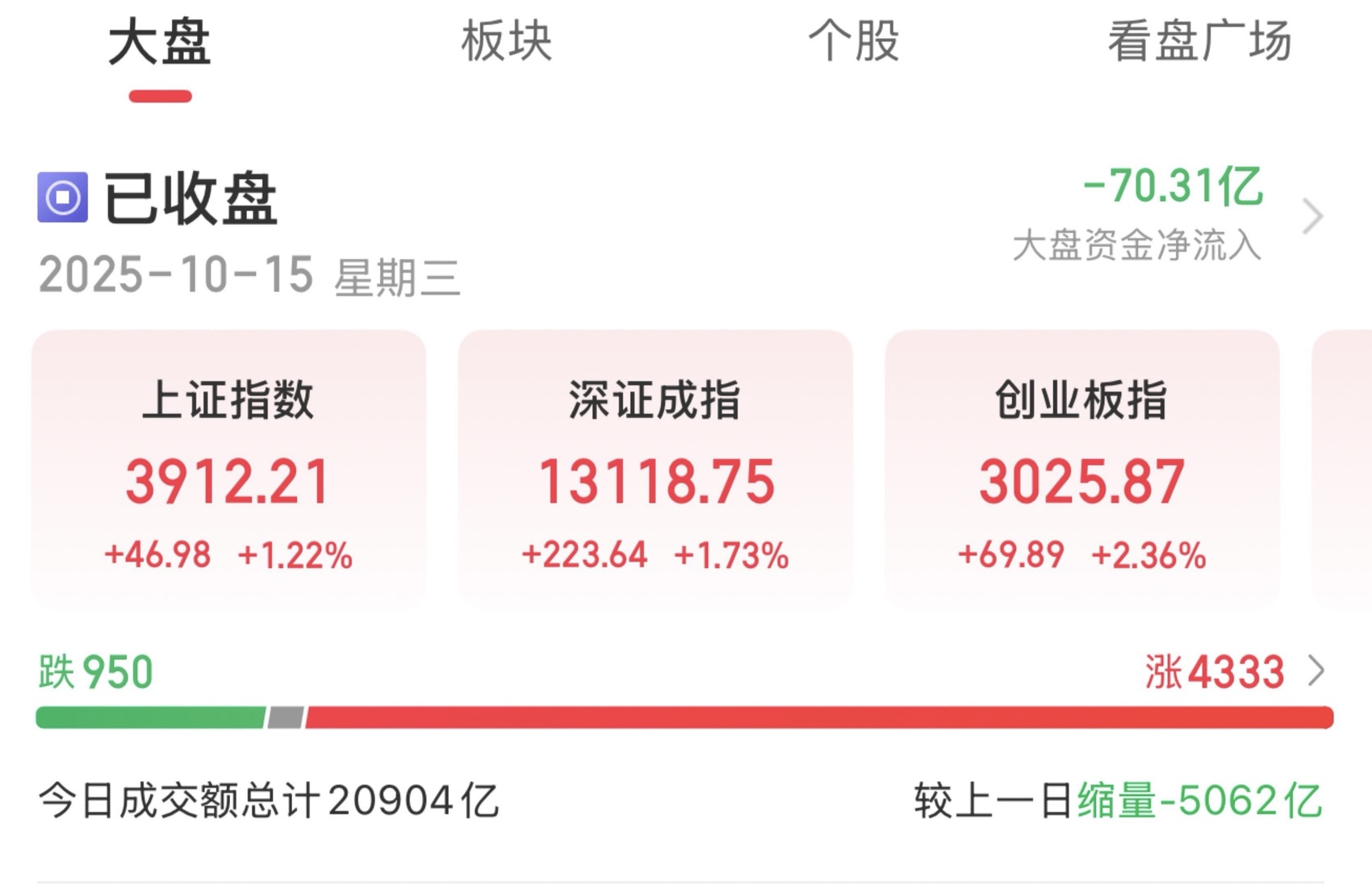 10月14日午盘恐慌性下跌,很多投资者慌张跑路,觉得持续调整开始了——这样的情绪一直持续到10月15日的早盘,沪指开盘就惯性下跌,直接跌破技术派的短线生死线,20日均线3861.87点,看空资金纷纷离场。10时40分,在3857.67点的全天最低点,抄底的做多资金奋力拉升,多空双方几经较量后,午盘14时11分,看多资金获胜——科技板块发力点燃全场看涨情绪,沪指站上3900点。截至收盘,上证指数涨1.22%,收报3912.21点;深成指涨1.73%,收报13118.75点;创业板指涨2.36%,收报3025.87点。