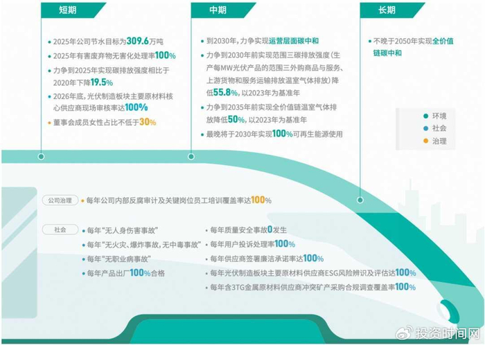 可持续发展战略的落实不仅需要使命的引领、政策与承诺的护航,还需要明确的目标与指标体系作为指引。通威股份在环境、社会、治理三大维度下,分短、中、长期提出20项目标,组成通威股份可持续发展目标与指标体系。