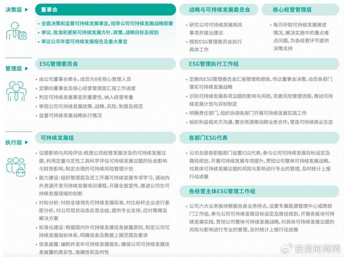 自 2021 年起,通威股份即设立“ESG 管理委员会”,由董事长牵头主导,构建了“决策-管理-执行”的三级管理体系,明确内部职责分工,将 ESG 绩效与高管薪酬挂钩。
