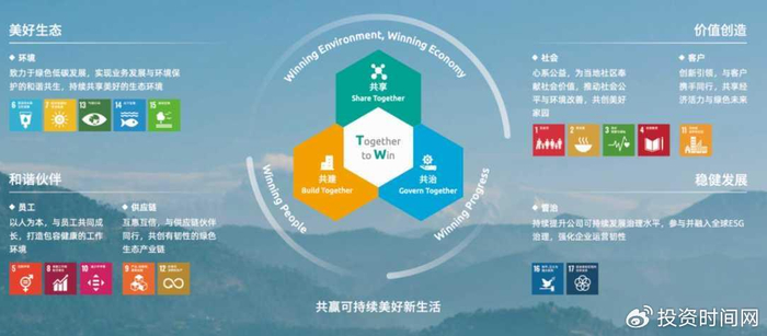 通威股份精心构建并推出与通威英文缩写“TW”相呼应的“Together to win”可持续发展战略。投资时间网、标点财经研究院了解到,通威股份深化“Together to Win”可持续发展战略,以共建、共治、共享可持续美好生活作为该公司三大可持续发展使命,明确和谐伙伴关系、稳健发展、美好生态和价值创造为四大可持续发展愿景。