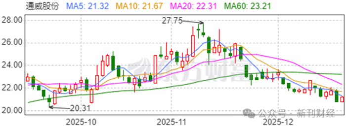 11月11日,通威股份迎来股价调整,26.72元的收盘价较前一交易日下跌1.62%,主力资金净流出3.38亿元。次日股价继续下跌6.06%,收盘价25.10元。11月20日,通威股份股价再遭重挫,单日下跌5.09%,主力资金当日净卖出1.63亿元。次日股价大幅低开并跳空击穿多根均线,至收盘时下跌6.59%。从11月10日起算至12月22日,通威股份的股价(收盘价)在32个交易日内,已累计下跌23.27%。