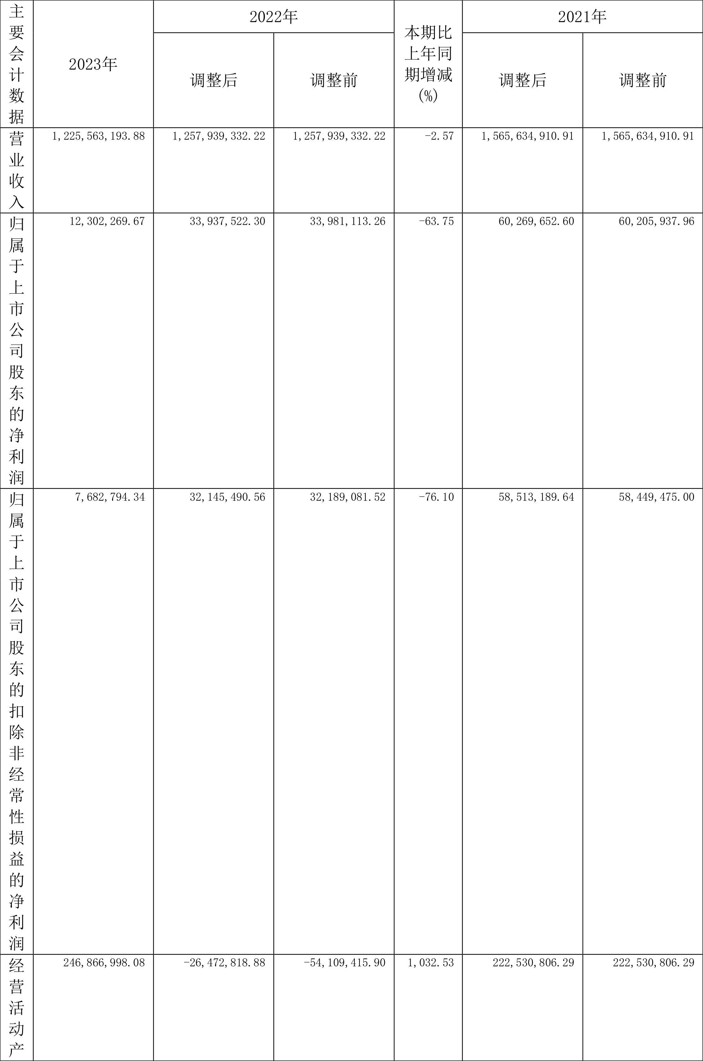 2023年,公司经营活动现金流净额为2.47亿元,同比增加2.73亿元;筹资活动现金流净额-1.76亿元,同比减少4.69亿元;投资活动现金流净额-2226.46万元,上年同期为-1943.63万元。