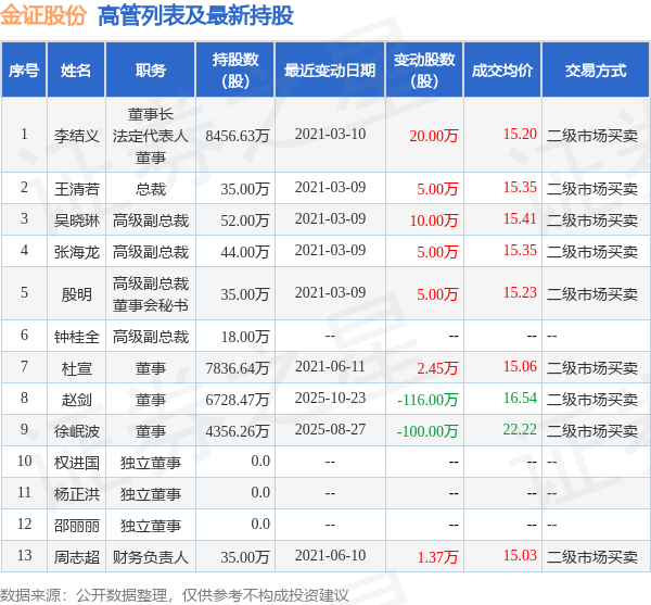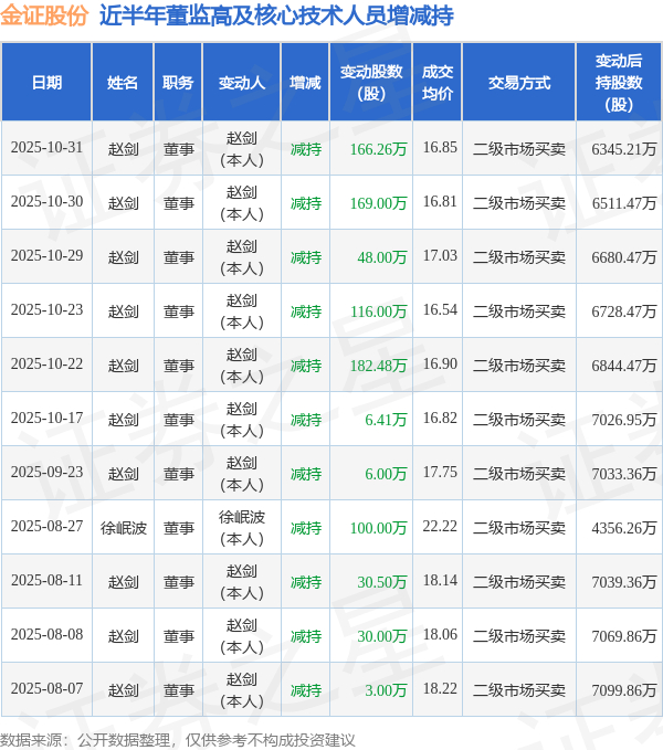 金证股份近半年内的董监高及核心技术人员增减持详情如下: