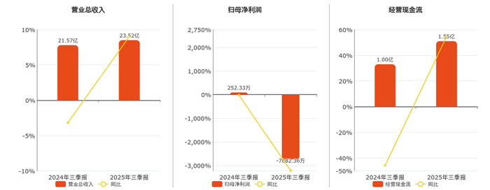 公司营业总收入为23.52亿元,在已披露的同业公司中排名第14,较去年同报告期营业总收入增加1.95亿元,同比较去年同期上涨9.02%。归母净利润为-7882.36万元,在已披露的同业公司中排名第32,较去年同报告期归母净利润减少8134.69万元,同比较去年同期下降3223.80%。经营活动现金净流入为1.55亿元,在已披露的同业公司中排名第17,较去年同报告期经营活动现金净流入增加5471.12万元,同比较去年同期上涨54.50%。
