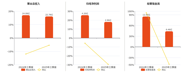 公司营业总收入为22.78亿元,在已披露的同业公司中排名第44,较去年同报告期营业总收入减少1.31亿元,同比较去年同期下降5.43%。归母净利润为2.96亿元,在已披露的同业公司中排名第39,较去年同报告期归母净利润减少1.24亿元,同比较去年同期下降29.58%。经营活动现金净流入为6.46亿元,在已披露的同业公司中排名第44,较去年同报告期经营活动现金净流入减少6.09亿元,同比较去年同期下降48.52%。
