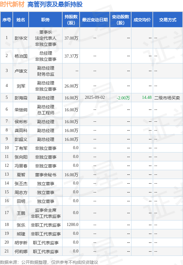 时代新材的高管列表及最新持股情况如下: