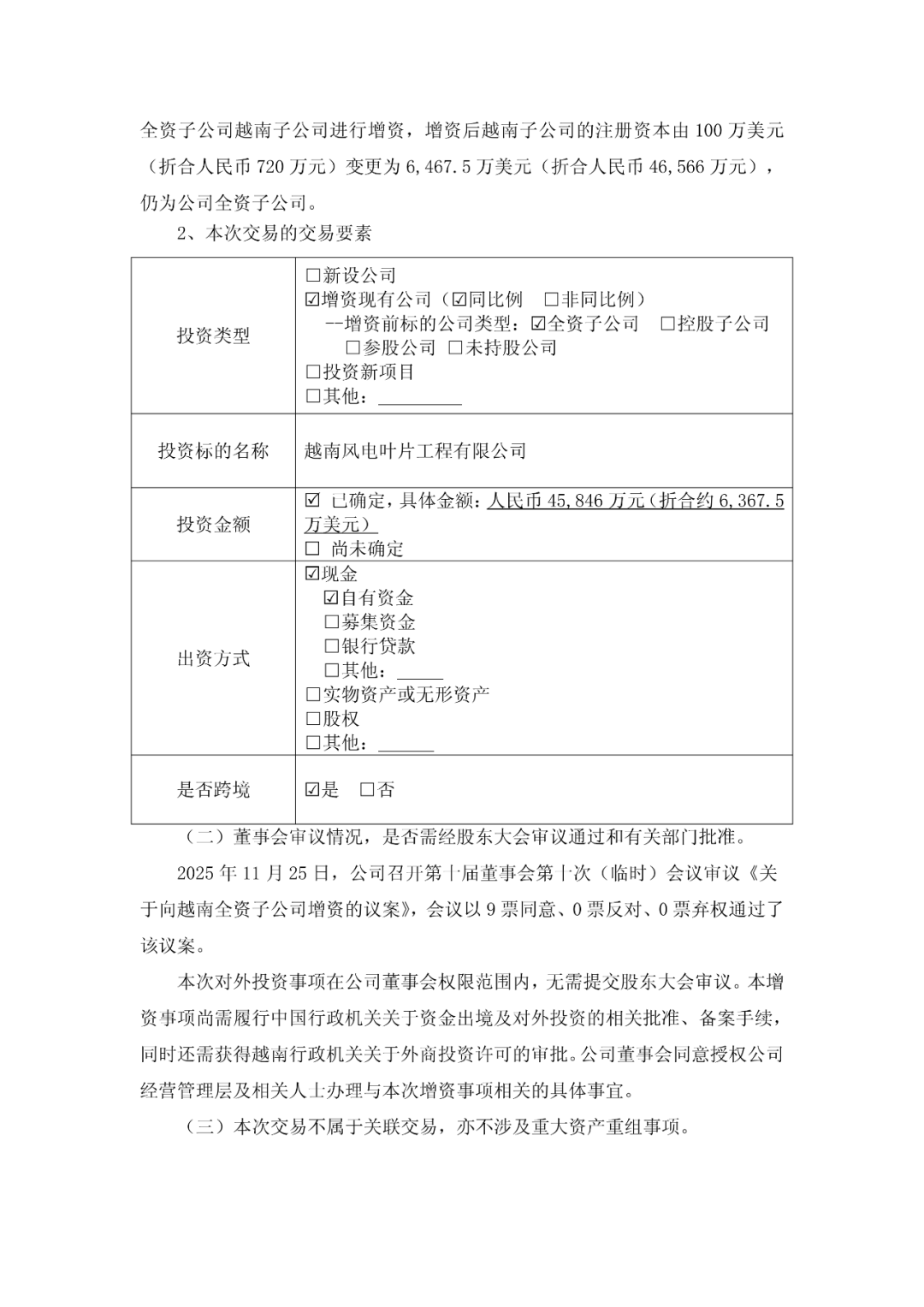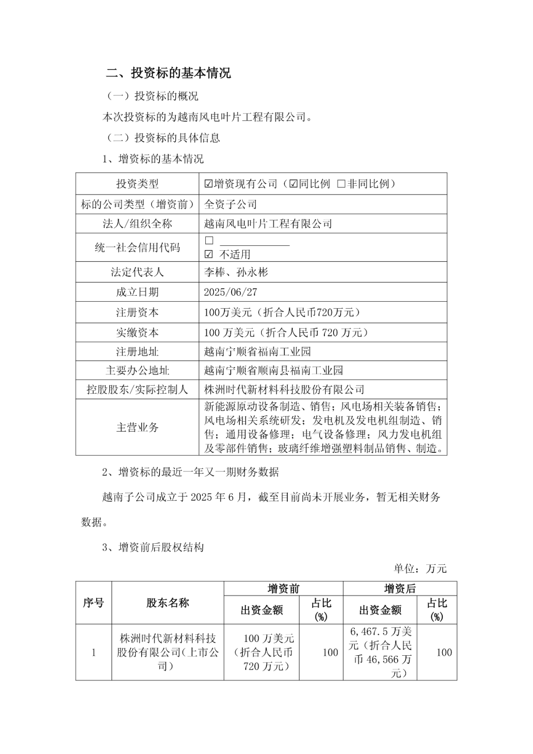 风芒能源获悉,11月25日,时代新材发布公告称,公司拟以自有资金4.5846亿元人民币(折合约6367.5万美元)向越南风电叶片工程有限公司进行增资,增资后越南子公司的注册资本由100万美元变更为6467.5万美元。