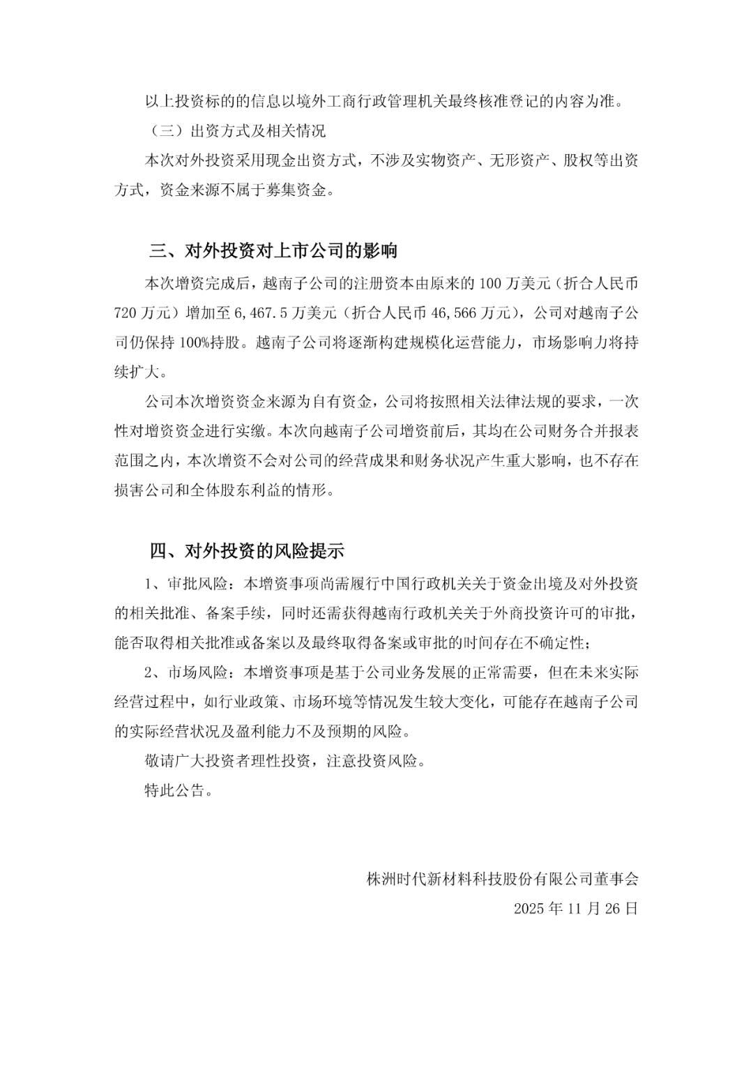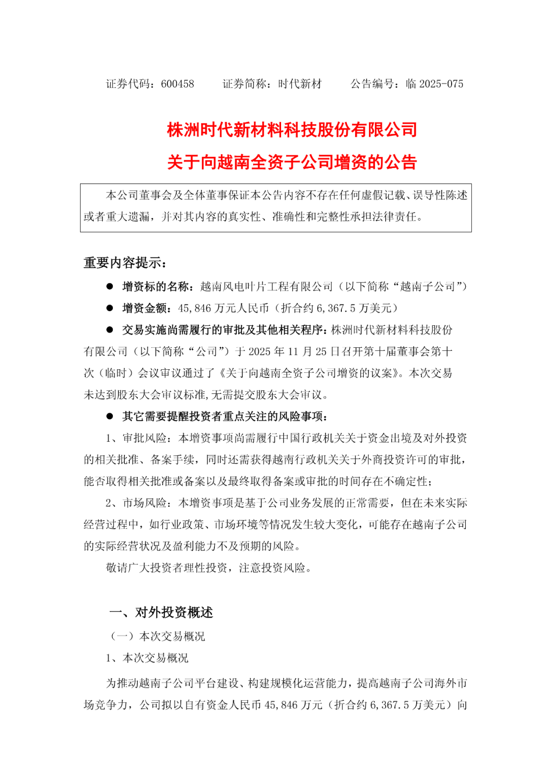 时代新材:拟向越南全资子公司增资4.58亿元
