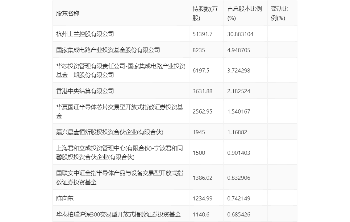 半年报显示,2024年上半年末公司十大流通股东中,新进股东为华芯投资管理有限责任公司-国家集成电路产业投资基金二期股份有限公司、嘉兴晨壹恒炘股权投资合伙企业(有限合伙)、上海君和立成投资管理中心(有限合伙)-宁波君和同馨股权投资合伙企业(有限合伙),取代了一季度末的天安人寿保险股份有限公司-传统产品、范伟宏、江忠永。在具体持股比例上,华夏国证半导体芯片交易型开放式指数证券投资基金、国联安中证全指半导体产品与设备交易型开放式指数证券投资基金、华泰柏瑞沪深300交易型开放式指数证券投资基金持股有所上升,香港中央结算有限公司持股有所下降。