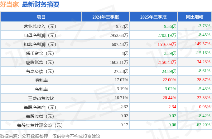 据证券之星公开数据整理,近期好当家(600467)发布2025年三季报。根据财报显示,好当家净利润同比下降8.45%。截至本报告期末,公司营业总收入9.36亿元,同比下降3.73%,归母净利润2703.19万元,同比下降8.45%。按单季度数据看,第三季度营业总收入2.25亿元,同比上升18.81%,第三季度归母净利润240.71万元,同比下降5.33%。