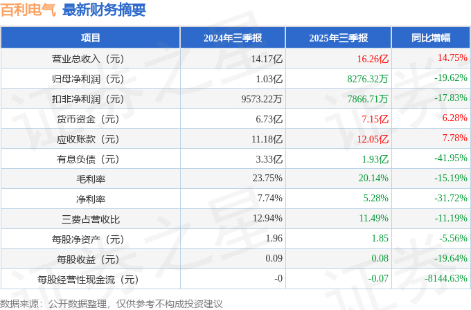 据证券之星公开数据整理,近期百利电气(600468)发布2025年三季报。截至本报告期末,公司营业总收入16.26亿元,同比上升14.75%,归母净利润8276.32万元,同比下降19.62%。按单季度数据看,第三季度营业总收入5.96亿元,同比上升16.62%,第三季度归母净利润2584.85万元,同比下降32.39%。本报告期百利电气公司应收账款体量较大,当期应收账款占最新年报营业总收入比达61.4%。