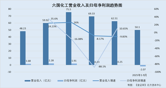 根据《金证研》北方资本中心研究,2021-2024年及2025年1-9月,六国化工营业收入增速分别为24.23%、26%、-8.17%、-9.83%、3.9%,归母净利润增速分别为35.6%、-16.08%、-88.1%、10.65%、-640.3%。