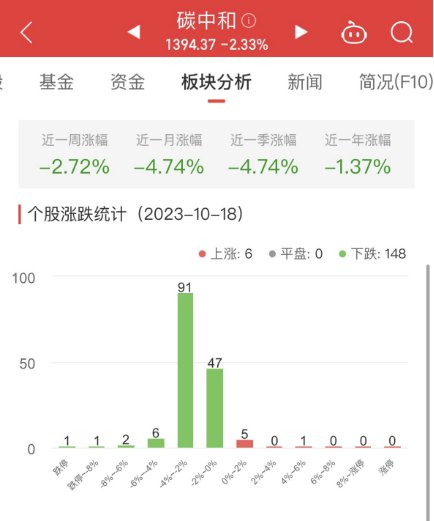 中国经济网北京10月18日讯今日,碳中和板块整体涨幅-2.33%,其中6只股票上涨,148只股票下跌。