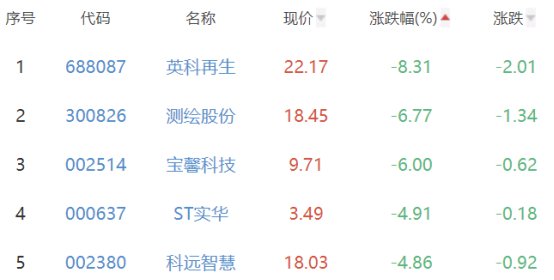 英科再生、测绘股份、宝馨科技、ST实华、科远智慧位列涨幅榜后五位,涨幅分别为-8.31%、-6.77%、-6.00%、-4.91%、-4.86%。