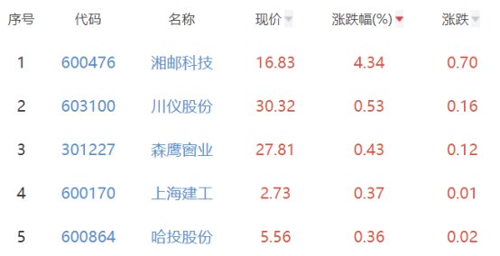 其中,湘邮科技、川仪股份、森鹰窗业、上海建工、哈投股份位列板块涨幅前五位,涨幅分别为4.34%、0.53%、0.43%、0.37%、0.36%。