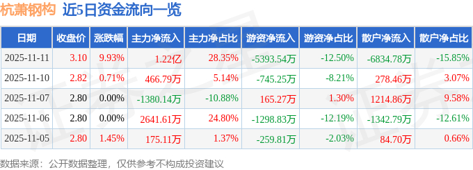 证券之星消息,杭萧钢构11月11日涨停收盘,收盘价3.1元。该股于9点43分涨停,3次打开涨停,截止收盘封单资金为4300.02万元,占其流通市值0.59%。