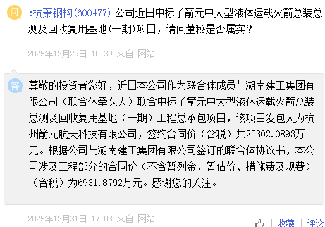 2025年12月29日10:39,有投资者在“E互动”上对杭萧钢构提问称:“公司近日中标了箭元中大型液体运载火箭总装总测及回收复用基地(一期)项目,请问董秘是否属实?”
