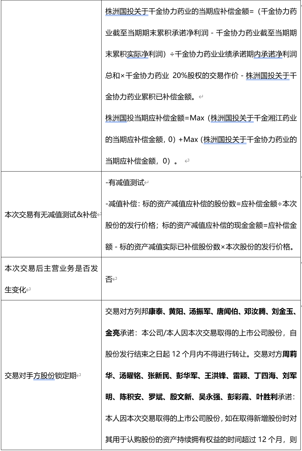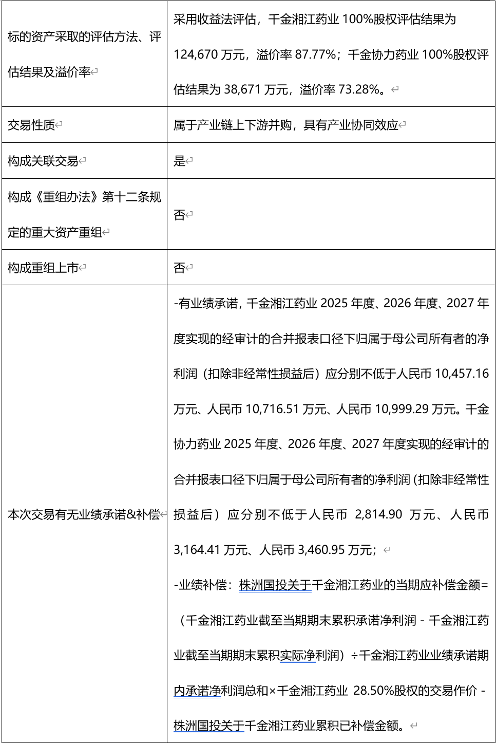 株洲国投作为业绩承诺方,承诺千金湘江药业2025年、2026年、2027年净利润分别不低于1.046亿元、1.07亿元、1.10亿元,累计业绩承诺3.22亿元;承诺千金协力药业2025年、2026年、2027年净利润分别不低于2814.90万元、3164.41万元、3460.95万元,累计业绩承诺9440.26万元。
