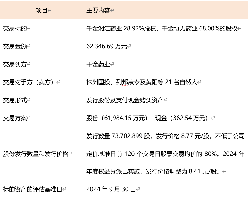本次交易,是由上市公司千金药业拟通过发行股份的方式购买株洲国投、列邦康泰持有的千金湘江药业28.92%的股权,拟通过发行股份及支付现金的方式购买株洲国投和黄阳等21名自然人持有的千金协力药业68.00%的股权,交易作价6.23亿元。