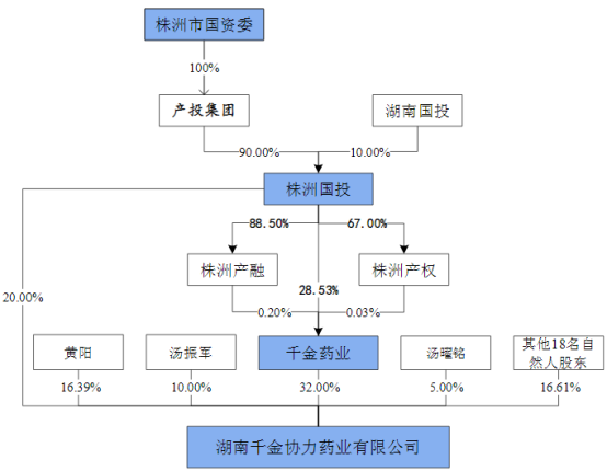 千金协力药业——上市公司直接持有千金协力药业32.00%的股权,为千金协力药业控股股东;实控人为株洲市国资委。