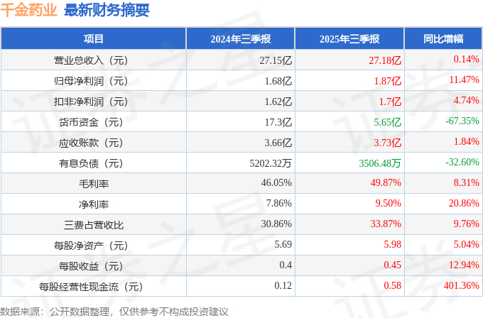 据证券之星公开数据整理,近期千金药业(600479)发布2025年三季报。截至本报告期末,公司营业总收入27.18亿元,同比上升0.14%,归母净利润1.87亿元,同比上升11.47%。按单季度数据看,第三季度营业总收入9.0亿元,同比上升13.91%,第三季度归母净利润5963.0万元,同比上升18.42%。本报告期千金药业盈利能力上升,毛利率同比增幅8.31%,净利率同比增幅20.86%。