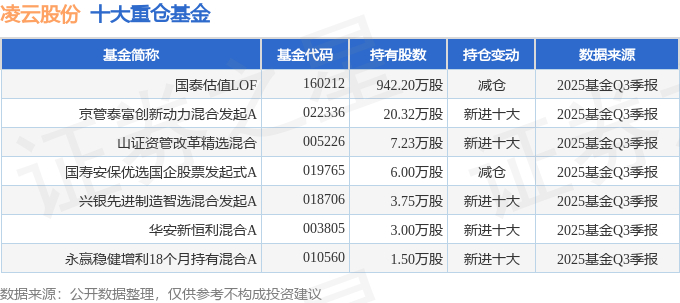 持有凌云股份最多的基金为国泰估值LOF,目前规模为15.66亿元,最新净值4.1304(10月28日),较上一交易日下跌0.07%,近一年上涨57.7%。该基金现任基金经理为王兆祥。