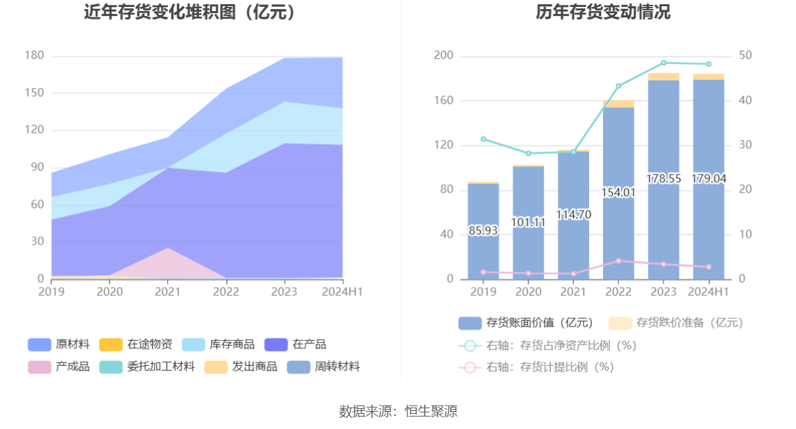 从存货变动来看,截至2024年上半年末,公司存货账面价值为179.04亿元,占净资产的48.25%,较上年末增加4854.36万元。其中,存货跌价准备为5.17亿元,计提比例为2.81%。