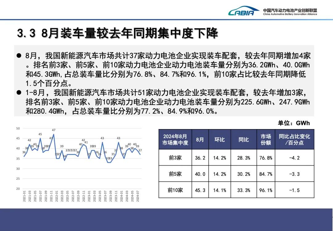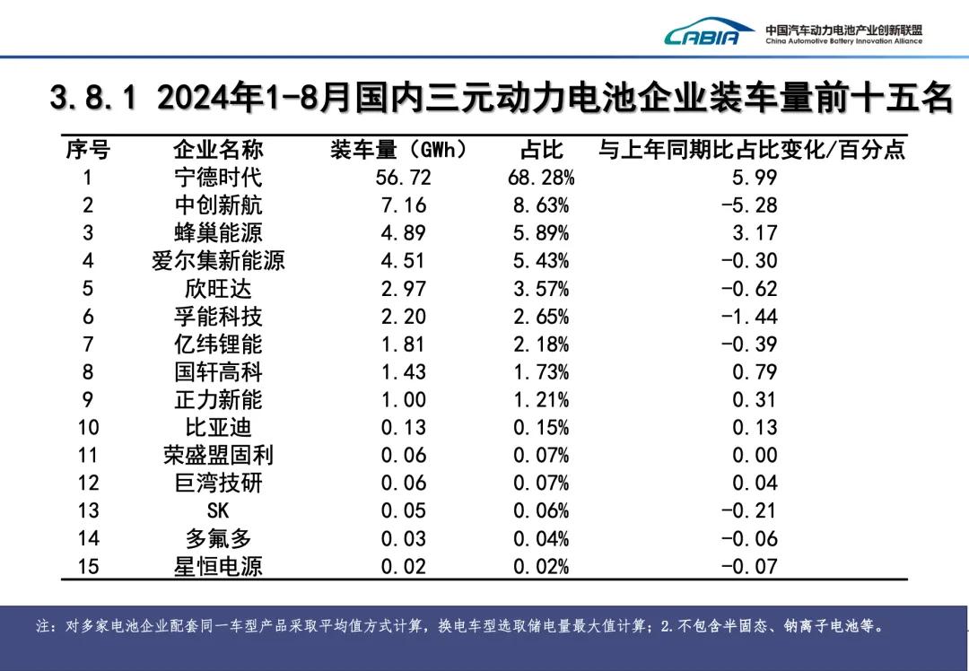 2024年8月,中国动力电池装车量TOP15分别是宁德时代(装机量:20.98GWh;市占率:44.46%)、比亚迪(11.78GWh;24.96%)、中创新航(3.47GWh;7.34%)、国轩高科(2.16GWh;4.58%)、欣旺达(1. 58GWh;3.35%)、亿纬锂能(1. 28GWh;2.71%)、蜂巢能源(1.26GWh;2.66%)、爱尔集新能源(0.99GWh;2.10%)、正力新能(0.96GWh;2.04%)、瑞浦兰钧(0.88GWh;1.86%)、极电新能源(0.58GWh;1. 23%)、孚能科技(0.29GWh;0.61%)、耀宁新能源(0.25Wh;0.54%)、多氟多(0.25Wh;0.53%)、因湃电池(0.11Wh;0.24%)。
