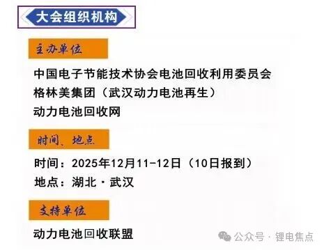 动力电池回收网消息,“2025中国动力电池回收利用行业回收年会暨新型、高效提锂技术发展论坛”将于12月11-12日在武汉举办,规模:500+,大会主题:绿色循环·高效提锂。