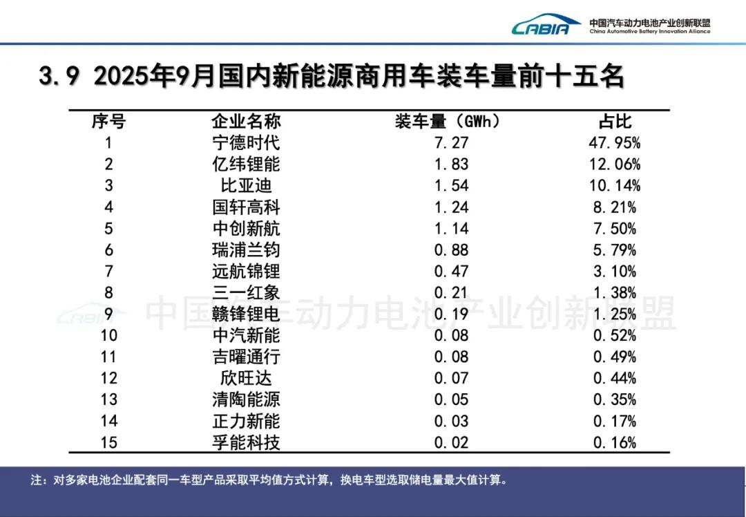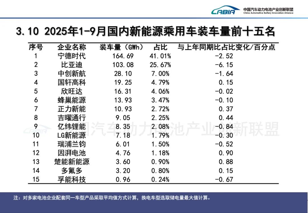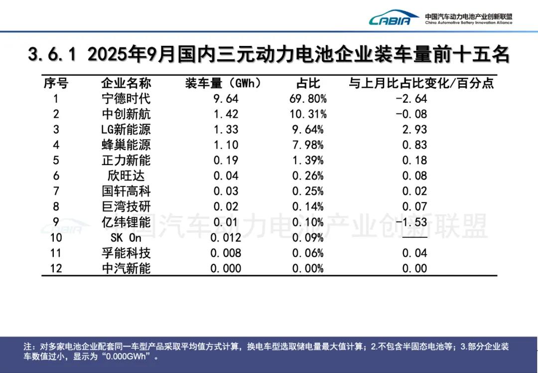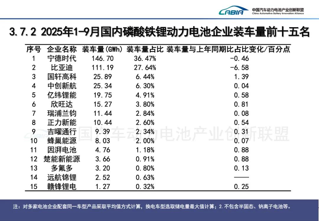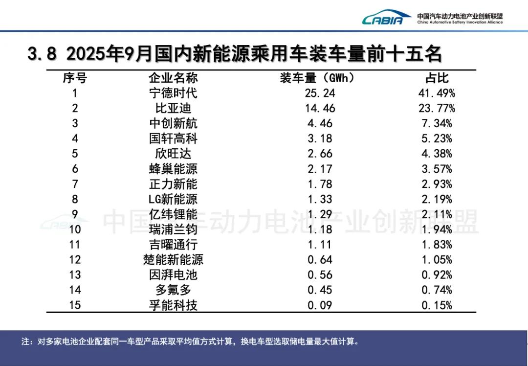 2025年9月,中国动力电池装车量TOP15分别是宁德时代(装机量:32.51GWh;市占率:42.81%)、比亚迪(16.00GWh;21.07%)、中创新航(5.60GWh;7.38%)、国轩高科(4.42GWh;5.83%)、亿纬锂能(3.11GWh;4.10%)、欣旺达(2.73GWh;3.60%)、蜂巢能源(2.19GWh;2.88%)、瑞浦兰钧(2.06GWh;2.71%)、正力新能(1.81GWh;2.38%)、LG新能源(1.33GWh;1.75%)、吉曜通行(1.33GWh;1.75%)、楚能新能源(0.65GWh;0.85%)、因湃电池(0.56GWh;0.73%)、远航锦锂(0.347GWh;0.62%)、多氟多(0.45GWh;0.59%)。