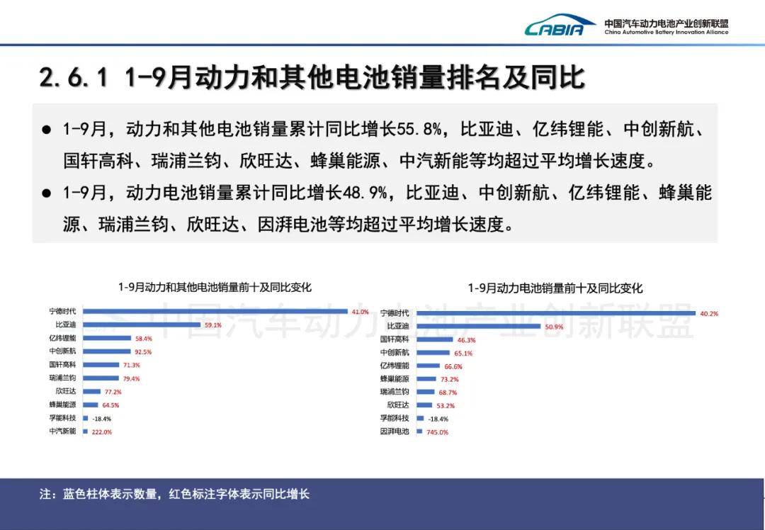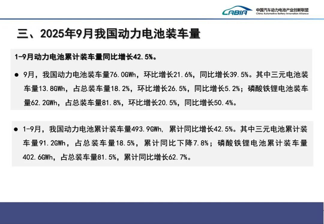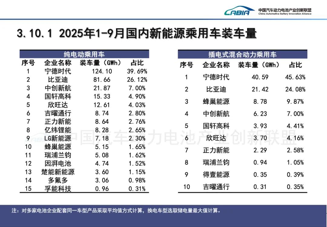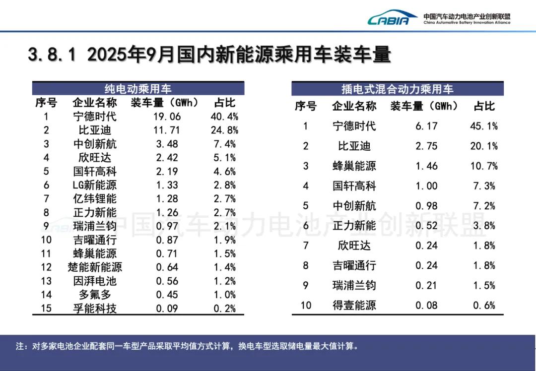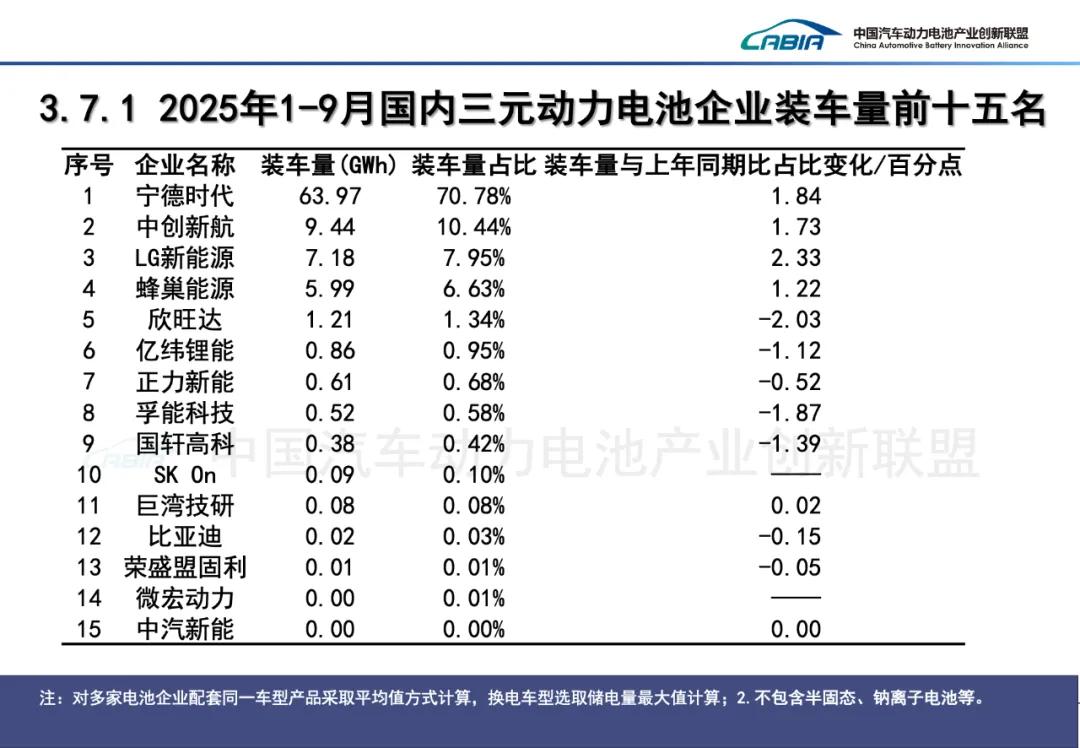 2025年9月,中国动力电池装车量TOP15分别是宁德时代(装机量:32.51GWh;市占率:42.81%)、比亚迪(16.00GWh;21.07%)、中创新航(5.60GWh;7.38%)、国轩高科(4.42GWh;5.83%)、亿纬锂能(3.11GWh;4.10%)、欣旺达(2.73GWh;3.60%)、蜂巢能源(2.19GWh;2.88%)、瑞浦兰钧(2.06GWh;2.71%)、正力新能(1.81GWh;2.38%)、LG新能源(1.33GWh;1.75%)、吉曜通行(1.33GWh;1.75%)、楚能新能源(0.65GWh;0.85%)、因湃电池(0.56GWh;0.73%)、远航锦锂(0.347GWh;0.62%)、多氟多(0.45GWh;0.59%)。