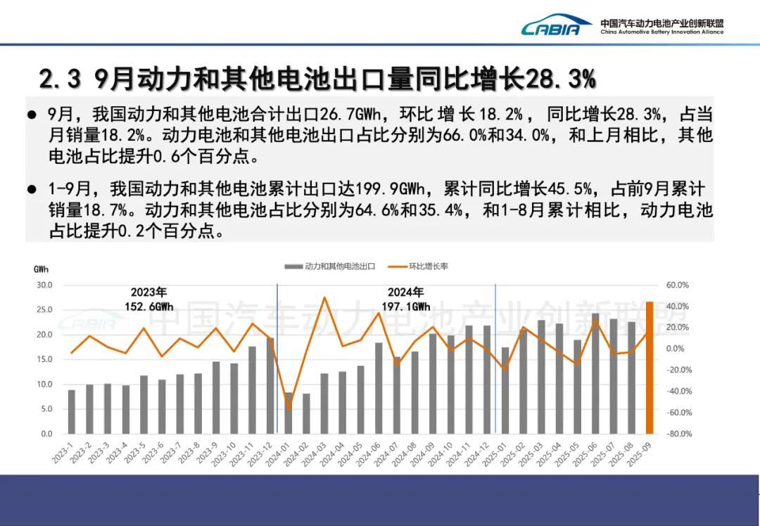 9月,我国动力和其他电池合计出口26.7GWh,环比增长18.2%,同比增长28.3%。合计出口占当月销量18.2%。其中,动力电池出口量为17.6GWh,占总出口量66.0%,环比增长17.1%,同比增长50.9%;其他电池出口量为9.1GWh,占总出口量34.0%,环比增长20.3%,同比下降0.5%。