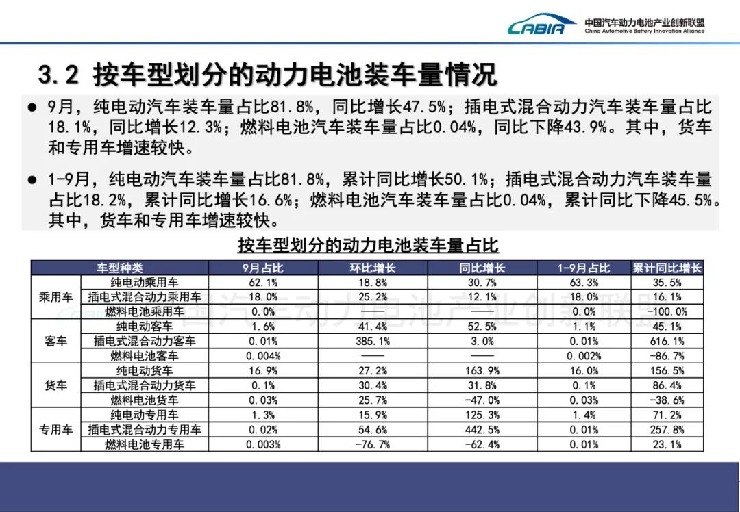 9月,我国动力电池装车量76.0GWh,环比增长21.6%,同比增长39.5%。其中三元电池装车量13.8GWh,占总装车量18.2%,环比增长26.5%,同比增长5.2%;磷酸铁锂电池装车量62.2GWh,占总装车量81.8%,环比增长20.5%,同比增长50.4%。