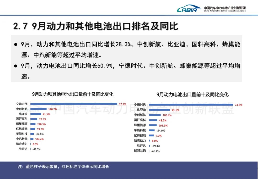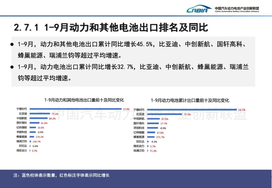 1-9月,我国动力和其他电池累计出口达199.9GWh,累计同比增长45.5%。合计累计出口占前9月累计销量18.7%。其中,动力电池累计出口为129.1GWh,占总出口量64.6%%,累计同比增长32.7%;其他电池累计出口量为70.7GWh,占总出口量35.4%,累计同比增长76.3%。