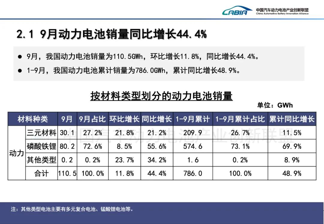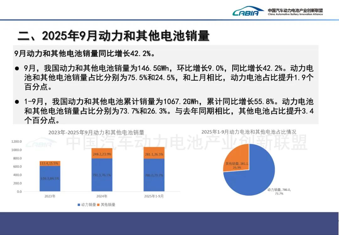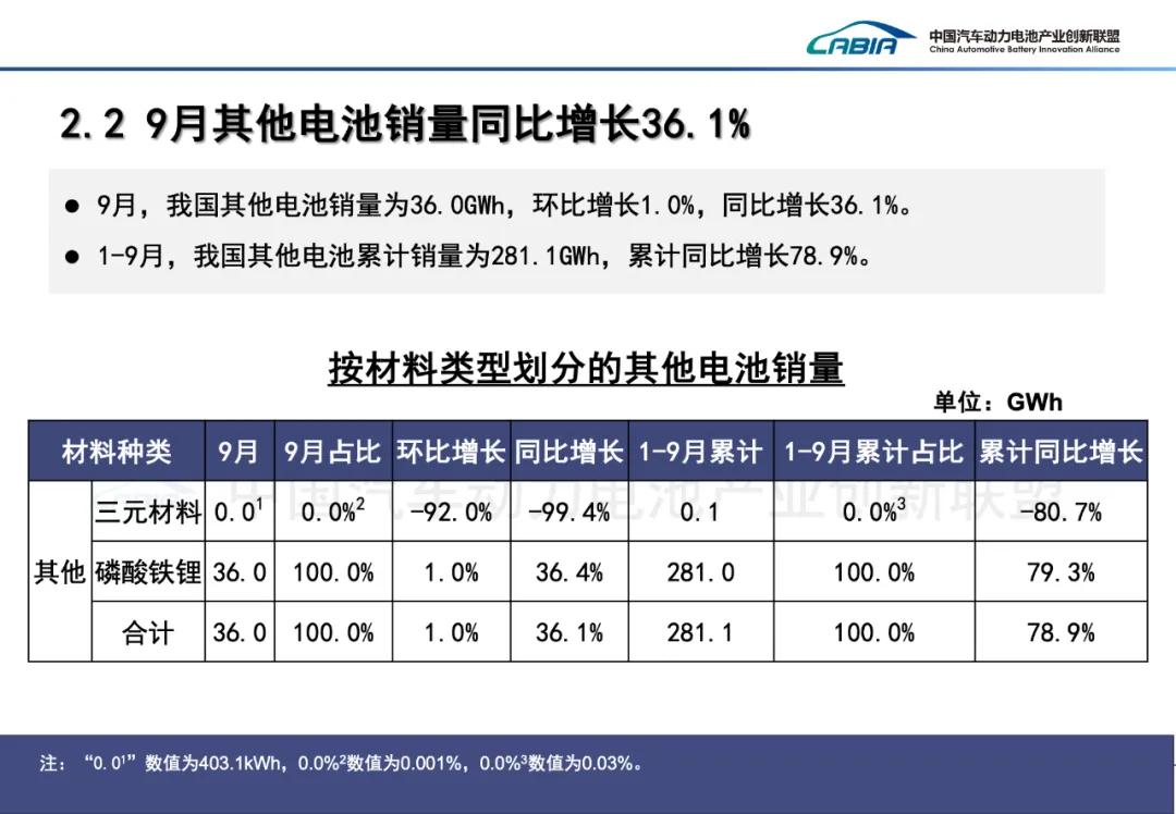 9月,我国动力和其他电池销量为146.5GWh,环比增长9.0%,同比增长42.2%。其中,动力电池销量为110.5GWh,占总销量75.5%,环比增长11.8%,同比增长44.4%;其他电池销量为36.0GWh,占总销量24.5%,环比增长1.0%,同比增长36.1%。