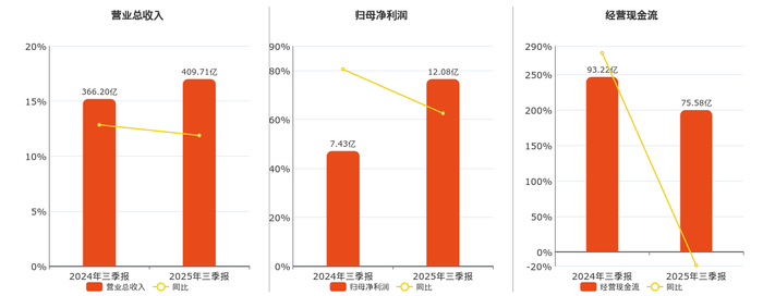 公司营业总收入为409.71亿元,在已披露的同业公司中排名第3,较去年同报告期营业总收入增加43.51亿元,实现5年连续上涨,同比较去年同期上涨11.88%。归母净利润为12.08亿元,在已披露的同业公司中排名第2,较去年同报告期归母净利润增加4.64亿元,实现3年连续上涨,同比较去年同期上涨62.50%。经营活动现金净流入为75.58亿元,在已披露的同业公司中排名第1。