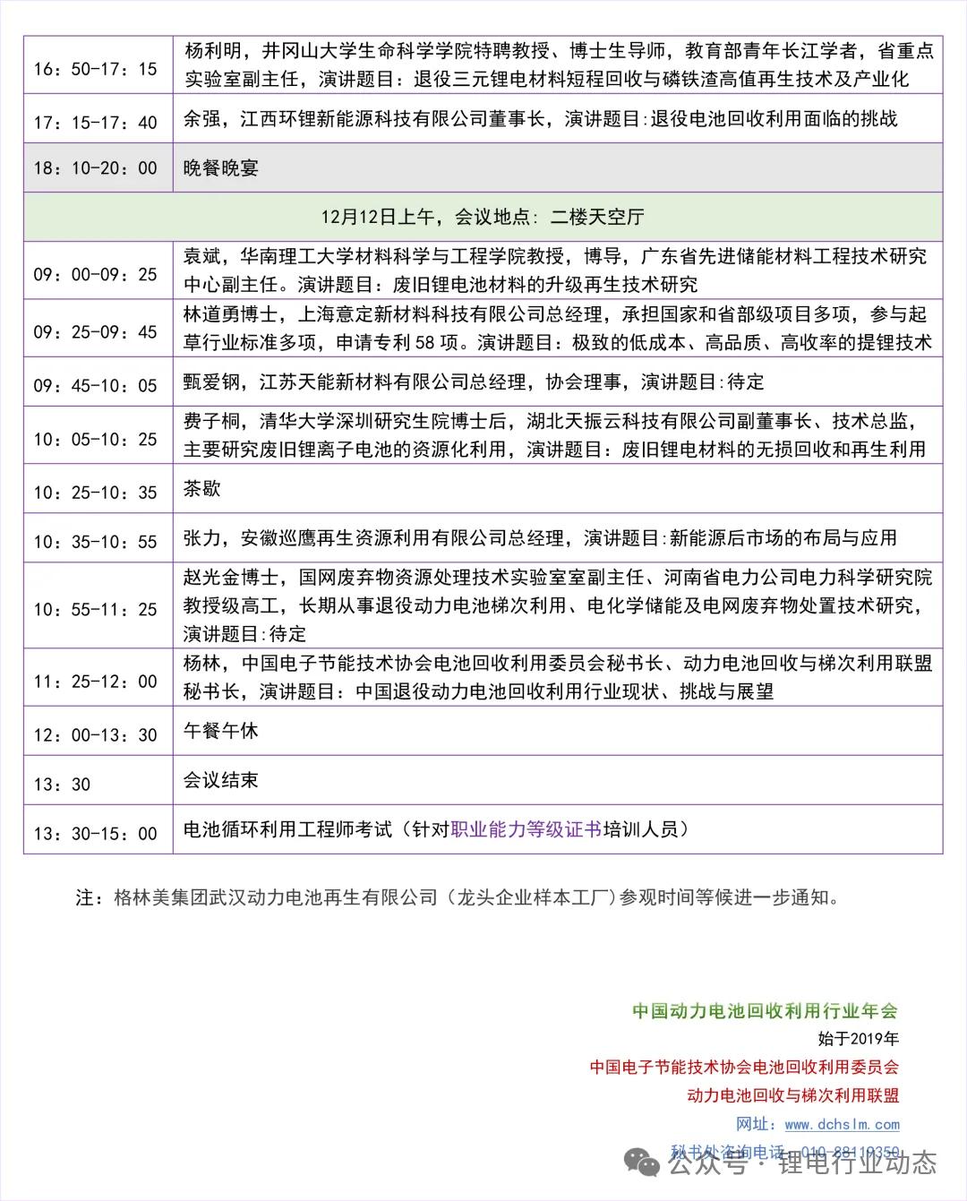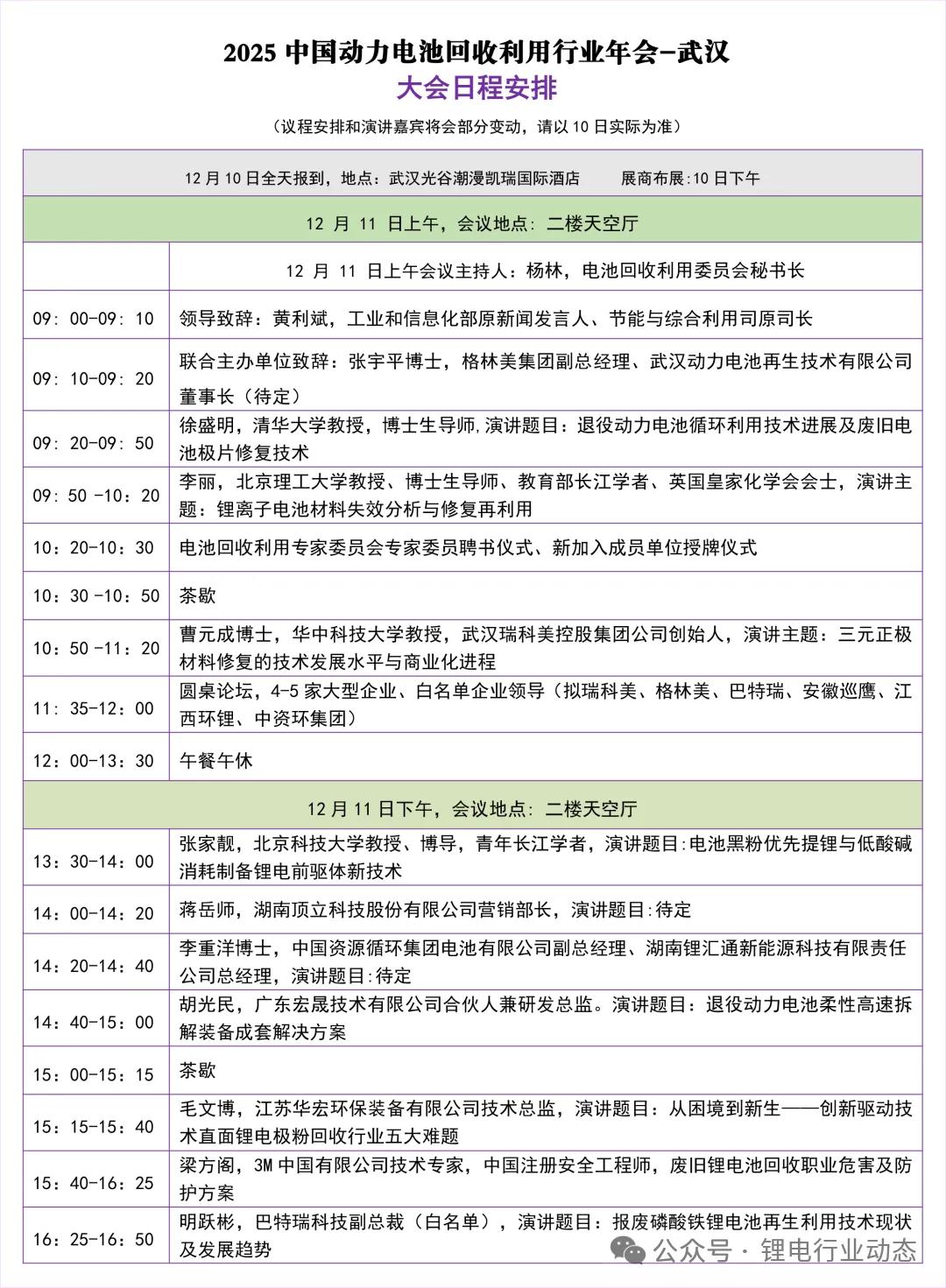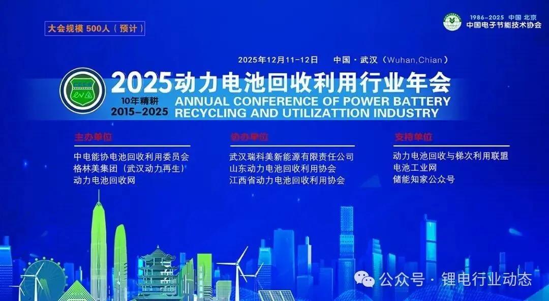 由中国电子节能技术协会电池回收利用专业委员会、格林美集团(武汉动力再生)、动力电池回收网主办,“2025中国动力电池回收利用行业回收年会”。武汉瑞科美新能源有限责任公司、山东动力电池回收利用协会、江西省动力电池回收利用协会协办,动力电池回收与梯次利用联盟大力支持的“2025中国动力电池回收利用行业回收年会”将于2025年12月11-12日在武汉召开。参观格林美武汉动力电池回收工厂(名额40人)。参会联系人:许玲13522252485(同微信)