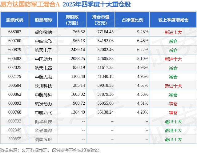 根据2025基金年报公募基金重仓股数据,重仓该股的公募基金共12家,其中持有数量最多的公募基金为易方达基金的易方达国防军工混合A。易方达国防军工混合A目前规模为72.81亿元,最新净值1.95(3月12日),较上一交易日下跌1.86%,近一年上涨36.84%。该公募基金现任基金经理为何崇恺。何崇恺在任的基金产品包括:易方达积极成长混合,管理时间为2021年5月29日至今,期间收益率为58.52%;易方达竞争优势企业混合A,管理时间为2025年6月21日至今,期间收益率为32.03%。