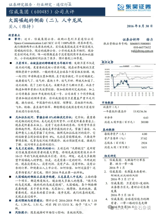 不论他的观点对不对,金石杂谈对徐力本人倒是印象深刻。2016年1月至2016年8月间,还在东吴担任首席的徐力曾发布多篇关于*ST信威的研究报告,并且在《大国崛起的侧面(二),人中龙凤》一文中,直呼信威集团实控人王靖为“人中龙凤”。