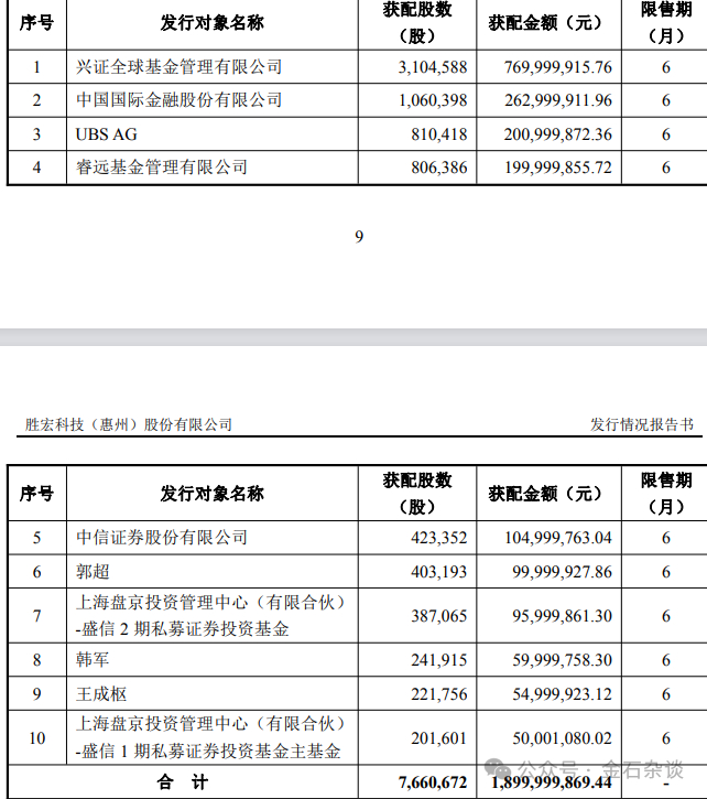根据胜宏科技公告,本次公司定增募资19亿,配售766万股,9名投资者成为幸运儿,其中兴证全球获配310万股,金额高达7.7亿,成为最大认购方;
