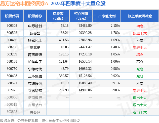 易方达裕丰回报债券A的前十大重仓股如下: