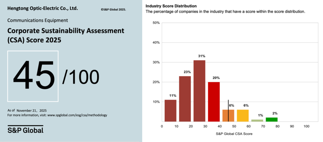 近日,全球最具影响力的可持续发展评价体系之一——标普全球企业可持续发展评估(S&P Global Corporate Sustainability Assessment,简称S&P CSA)正式发布最新ESG评估结果,亨通光电以45分的综合表现,领先全球行业标杆。这一成绩是亨通光电继MSCI ESG评级成功升至BBB后,在国际双权威评价体系中再次获得的高度认可,充分展示了在绿色低碳转型、任供应链责任、公司治理与创新管理等领域的系统化能力与全球竞争力。