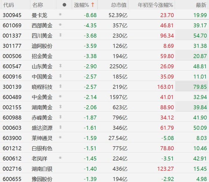 A股异动丨美元走强金价回调!黄金概念股集体下跌,曼卡龙跌超8%,西部黄金跌超4%