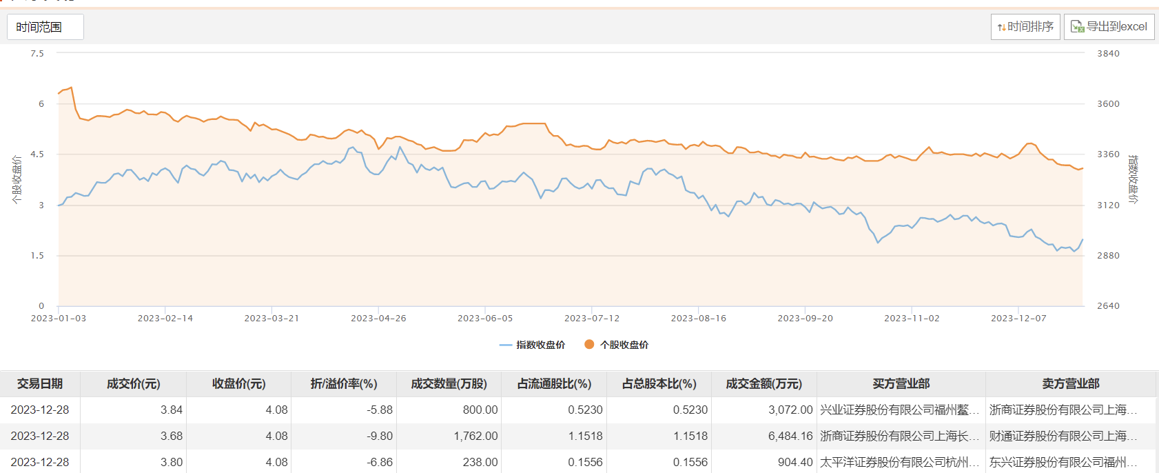 今日大宗交易成交2800万股,成交额1.05亿元,占当日总成交额的45.16%,成交均价3.74元,较市场收盘价折价8.33%,其中最高成交价3.84元,最低成交价3.68元。