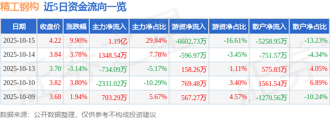 10月15日的资金流向数据方面,主力资金净流入1.19亿元,占总成交额29.84%,游资资金净流出6602.73万元,占总成交额16.61%,散户资金净流出5258.95万元,占总成交额13.23%。