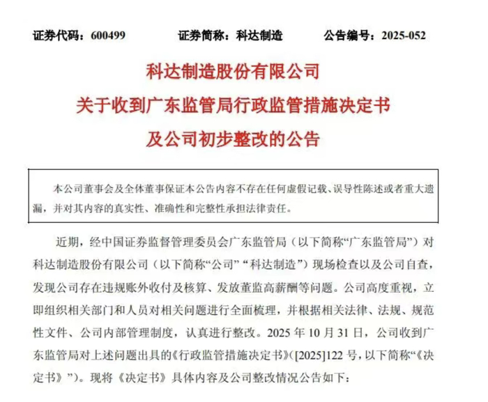 11月7日,记者从上市公司科达制造发布公告查询到,该公司近日收到中国证券监督管理委员会广东监管局出具的《行政监管措施决定书》,揭露了公司存在的多项违规行为。