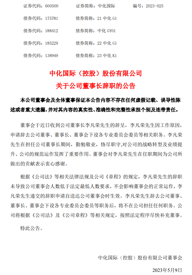上海证券交易所消息,中化国际董事会于近日收到公司董事长李凡荣先生的辞呈,李凡荣先生因工作原因,申请辞去公司董事、董事长、董事会下设各专业委员会委员等相关职务。