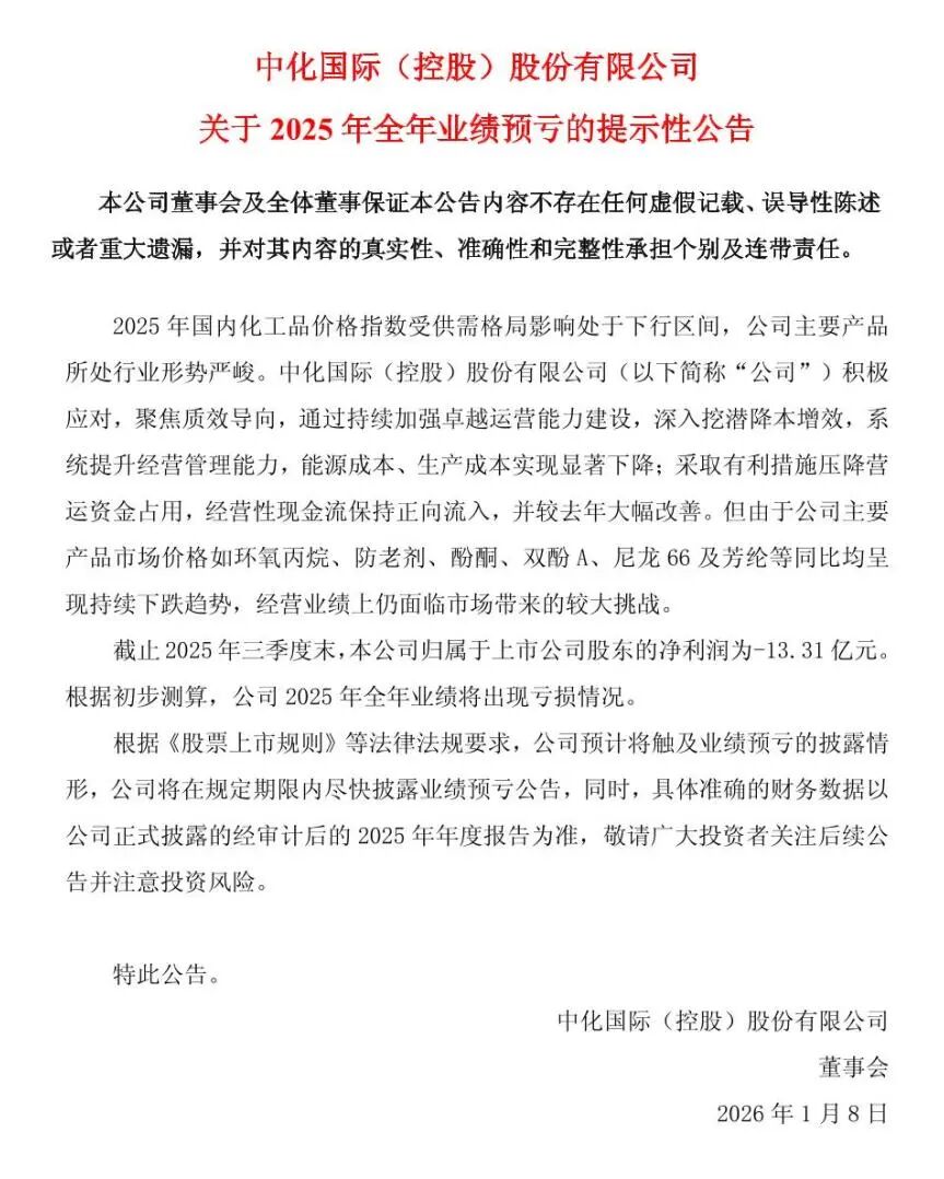 2026年1月8日,中化国际(控股)股份有限公司(以下简称“中化国际”)发布公告称,预计公司2025年全年业绩将出现亏损。